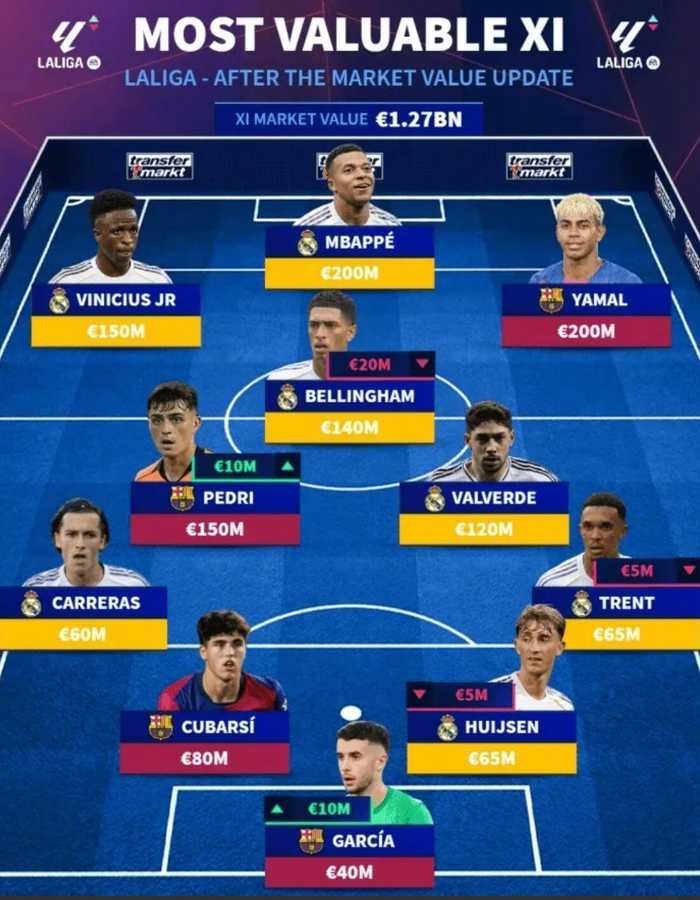 德转今日更新了西甲球员身价,并盘点了身价最高11人阵容,具体如下: 门将:乔安-加西亚(巴萨,4000万欧) 后卫:卡雷拉斯(...