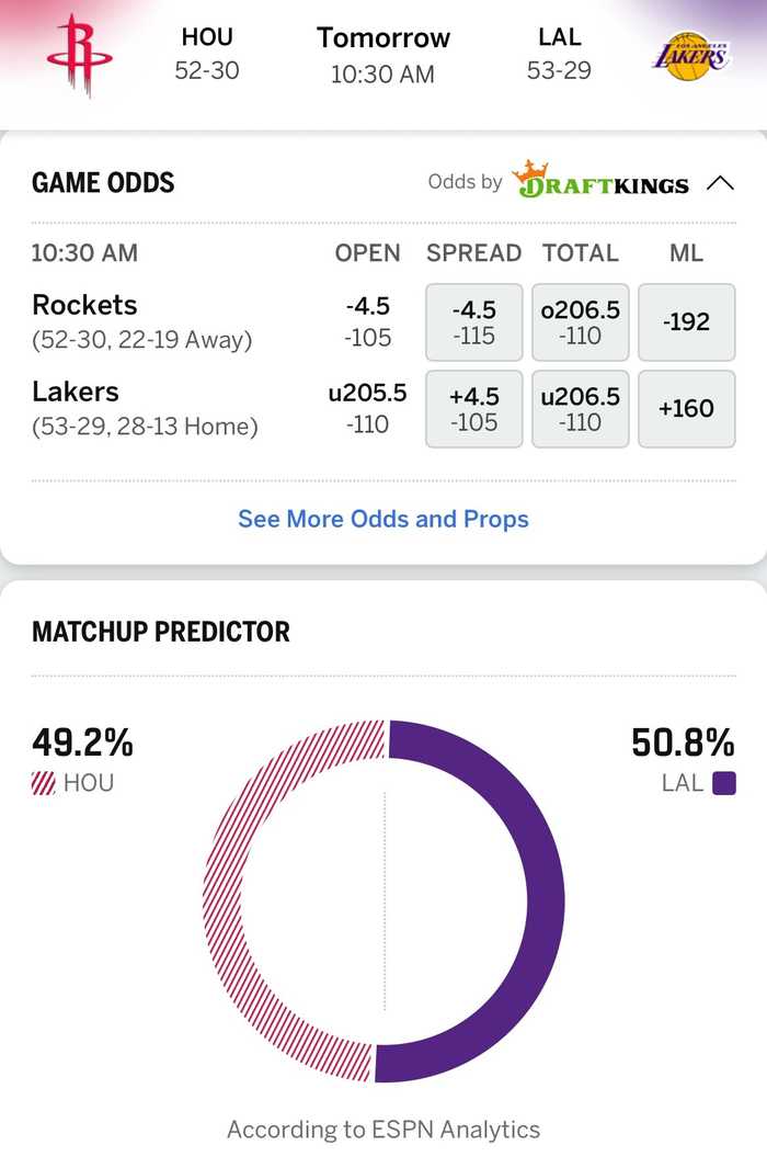 ESPN预测明天火箭vs湖人G2胜率:火箭49.2%,湖人50.8%,比赛时间上午10点半。
