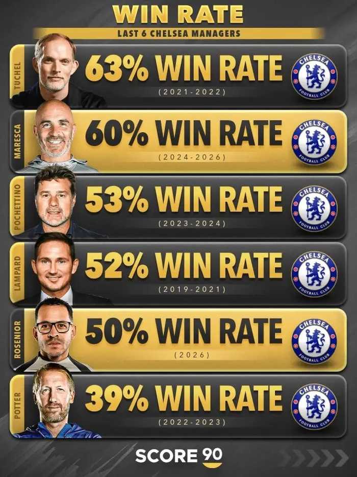 Score 90统计了切尔西最近六任主教练的带队胜率,详情如下: