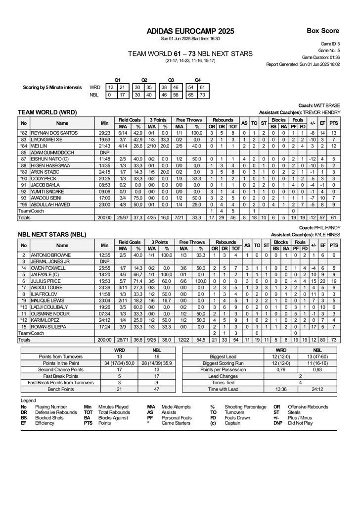 值得一提的是,本场比赛Team World全队21罚7中,对手NBL Next Stars则是22罚12中。