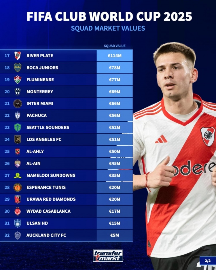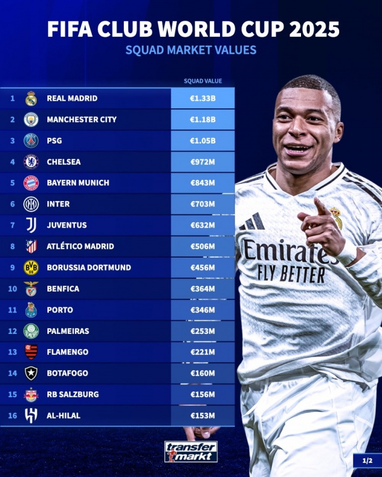 6月12日讯 德转对参与世俱杯的32支球队身价进行了排行。其中,共3支球队总身价超10亿欧元。皇马13.3亿欧元居首,曼城11.8亿欧元排名第二,本赛季的欧冠冠军巴黎10.5亿欧排名第三;迈阿密国际6600万欧排名第21,榜尾的奥克兰城全队身价仅500万欧。