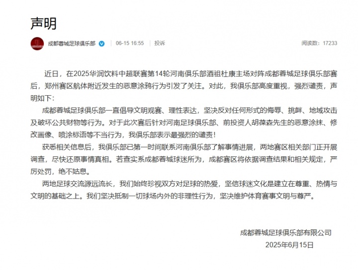 成都蓉城足球俱乐部一直倡导文明观赛、理性表达,坚决反对任何形式的侮辱、挑衅、地域攻击及破坏公共财物等行为。对于此次赛后针对河南足球俱乐部、前投资人胡葆森先生的恶意涂抹、修改画像、喷涂标语等不当行为,我俱乐部表示最强烈的谴责!