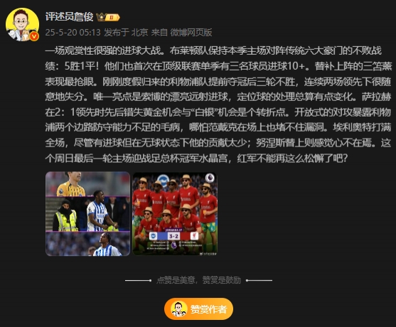 05月20日讯 英超第37轮,利物浦客场2-3不敌布莱顿,评述员詹俊对比赛做出点评。