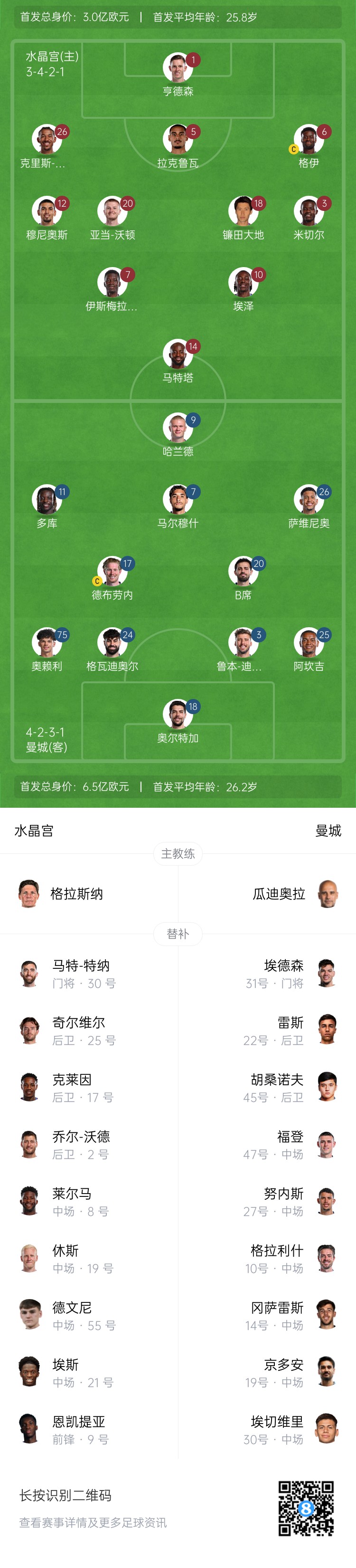 水晶宫首发:1-迪恩-亨德森、3-米切尔、5-拉克鲁瓦、6-格伊、12-穆尼奥斯、26-克里斯-理查兹、10-埃泽、18-镰田大地、20-沃顿、7-伊斯梅拉-萨尔、14-马特塔