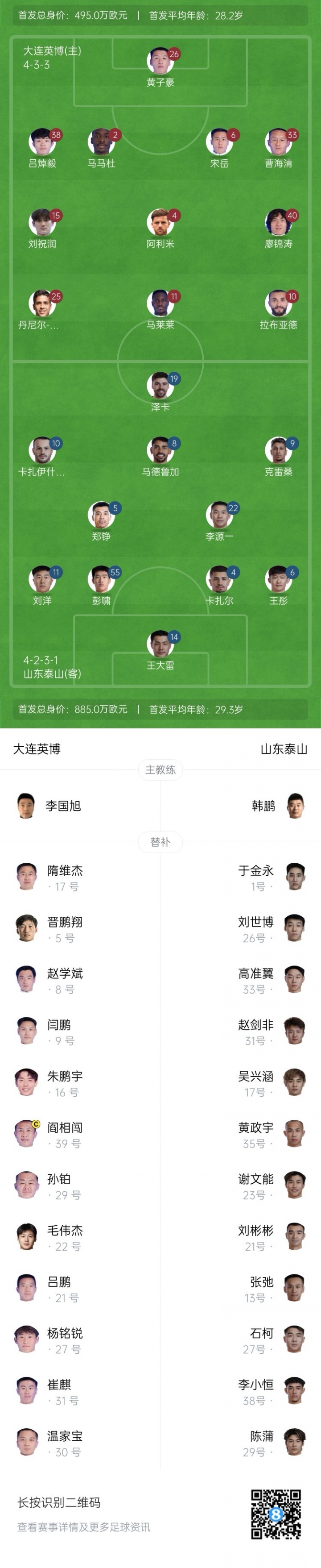 07月19日讯 北京时间19:00,中超第17轮,大连英博主场对阵山东泰山,赛前双方首发阵容出炉!本场泰山队由韩鹏出任代理主帅。